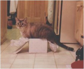 Clear large space on table for wrapping present.Go to closet and collect bag in which present is contained, and shut door. Open door and remove cat from closet. Go to cupboard and retrieve rolls of wrapping paper. Go back and remove cat from cupboard. Go to drawer, and collect transparent sticky tape, ribbons, scissors, labels, etc. . Lay out presents and wrapping materials on table, to enable wrapping strategy to be formed. Go back to drawer to get string, remove cat that has been in the drawer since last visit and collect string. Remove present from bag. Remove cat from bag. Open box to check present, remove cat from box, replace present. Lay out paper to enable cutting to size. Try and smooth out paper, realize cat is underneath and remove cat. Cut the paper to size, keeping the cutting line straight. Throw away first sheet as cat chased the scissors, and tore the paper. Cut second sheet of paper to size - by putting cat in the bag the present came in. Place present on paper. Lift up edges of paper to seal in present. Wonder why edges don't reach. Realize cat is between present and paper. Remove cat. Place object on paper, to hold in place while tearing transparent sticky tape. Spend 20 minutes carefully trying to remove transparent sticky tape from cat with pair of nail scissors. Seal paper with sticky tape, making corners as neat as possible. Look for roll of ribbon. Chase cat down hall in order to retrieve ribbon. Try to wrap present with ribbon in a two-directional turn. Re-roll ribbon and remove paper, which is now torn due to cat's enthusiastic ribbon chase. Repeat steps 13-20 until you reach last sheet of paper. Decide to skip steps 13-17 in order to save time and reduce risk of losing last sheet of paper. Retrieve old cardboard box that is the right size for sheet of paper. Put present in box, and tie down with string. Remove string, open box and remove cat. Put all packing materials in bag with present and head for locked room. Once inside lockable room, lock door and start to relay out paper and materials. Remove cat from box, unlock door, put cat outside door, close and relock. Repeat previous step as often as is necessary (until you can hear cat from outside door) Lay out last sheet of paper. (This will be difficult in the small area of the toilet, but do your best) Discover cat has already torn paper. Unlock door go out and hunt through various cupboards, looking for sheet of last year's paper. Remember that you haven't got any left because cat helped with this last year as well. Return to lockable room, lock door, and sit on toilet and try to make torn sheet of paper look presentable. Seal box, wrap with paper and repair by very carefully sealing with sticky tape. Tie up with ribbon and decorate with bows to hide worst areas. Label. Sit back and admire your handiwork, congratulate yourself on completing a difficult job. Unlock door, and go to kitchen to make drink and feed cat. Spend 15 minutes looking for cat until coming to obvious conclusion. Unwrap present, untie box and remove cat. Go to store and buy a gift bag. | ||||